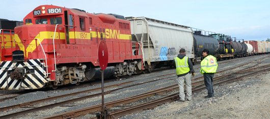 A Santa Maria Valley Railroad train departs the Guadalupe interchange, hauling cars to various customers in the valley.